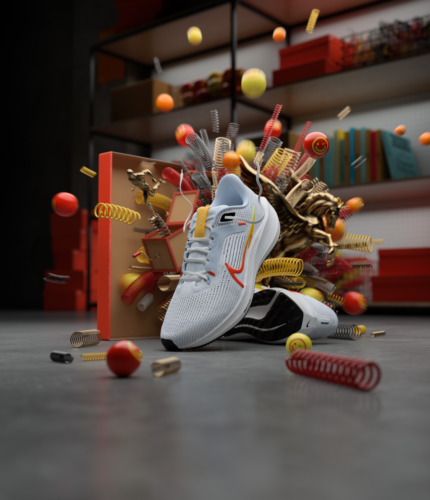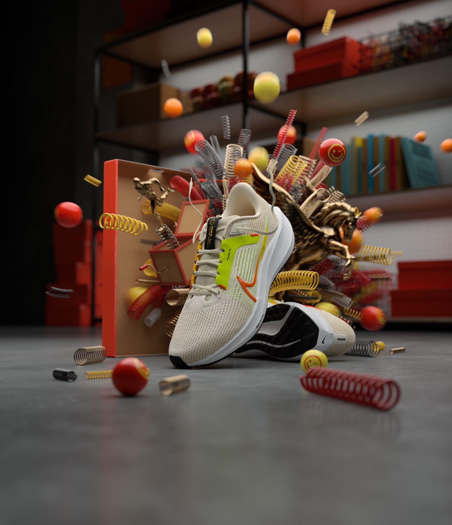 We approached the Nike Pegasus 40 film as a playful exploration of layered spring technology, focusing on how energy moves through the shoe rather than simply how it looks.